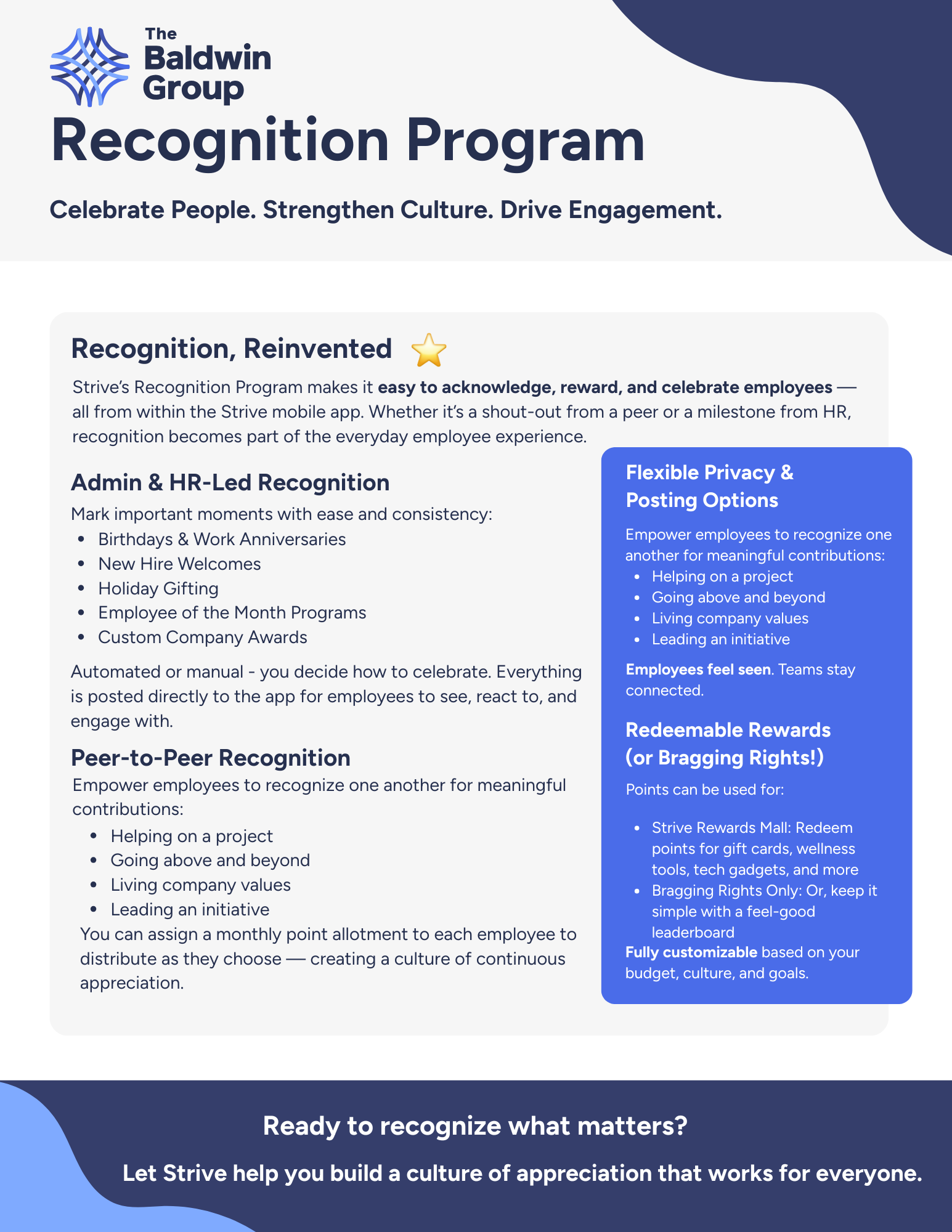 Strive’s Recognition Program makes it easy to acknowledge, reward, and celebrate employees — all from within the Strive mobile app. Whether it’s a shout-out from a peer or a milestone from HR, recognition becomes part of the everyday employee experience.