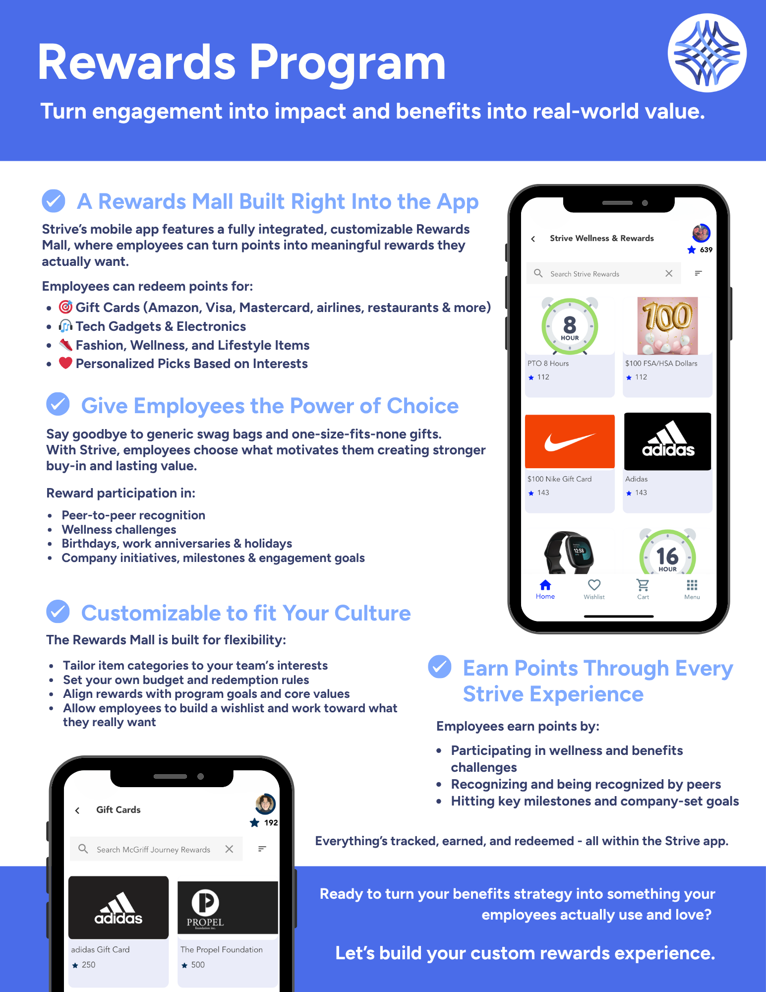 Enhance the solution by providing a custom rewards catalog & challenges for employees to earn points and rewards. From standard wellness challenges to department-specific challenges, create friendly competition and incentivize employees to complete important initiatives. Employees can then redeem those points in a custom catalog through gift cards, retail, travel, & more!