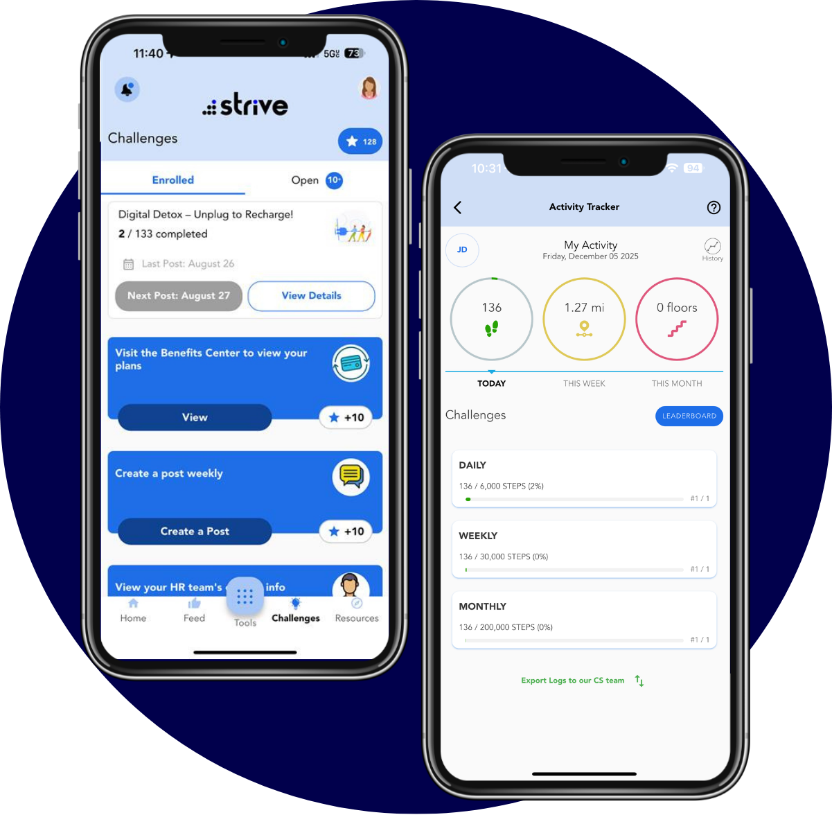 Empower employees to take proactive steps toward better health and wellbeing with integrated step tracking and ongoing wellness challenges. From daily wellness habits to annual preventative care activities, Strive helps employees stay engaged with their wellbeing and make more informed health decisions.​